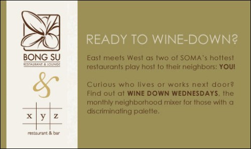 My pal Kevin Lee is the GM at Bong Su, where on Nov. 12 you can join Wine-Down Wednesdays. Wine-Down starts with a mixer and then an optional Chef Tasting Menu Dinner. There’s also one in October at XYZ.